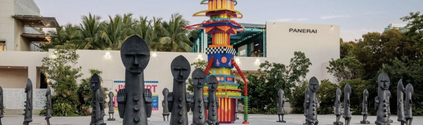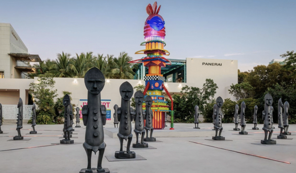 1. Caribbean art on is on show at Jungle Plaza in the Miami Design District with J’OUVERT, a large-scale public art installation by British-Trinidadian artist Zak Ové. Jungle Plaza has been transformed in an immersive landscape shaped by Afrofuturism, ancestral memory and collective ritual with 2 of the artist’s most significant monumental works. Anchoring the installation is The Mothership Connection (2022), a nearly 30-foot-tall totemic sculpture that merges African iconography with futuristic architectural forms.
