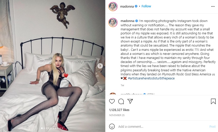 The Like a Prayer singer had initially posted the photos to Instagram in early November, but they were taken down after it was alleged that her nipple was exposed, thereby violating the social media platform’s nudity policy.