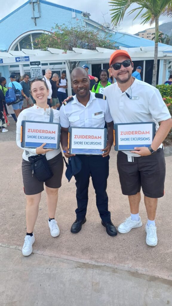 Shore Excursion representatives, Carnival Corporation’s Holland America (from left) Gimena Ibara, Liberty Mypamhadzi, and William Galindo, share a photo opportunity shortly after the vessel docked at the Ocho Rios cruise-ship port in St. Ann on Tuesday (November 11). (Photo: JIS)