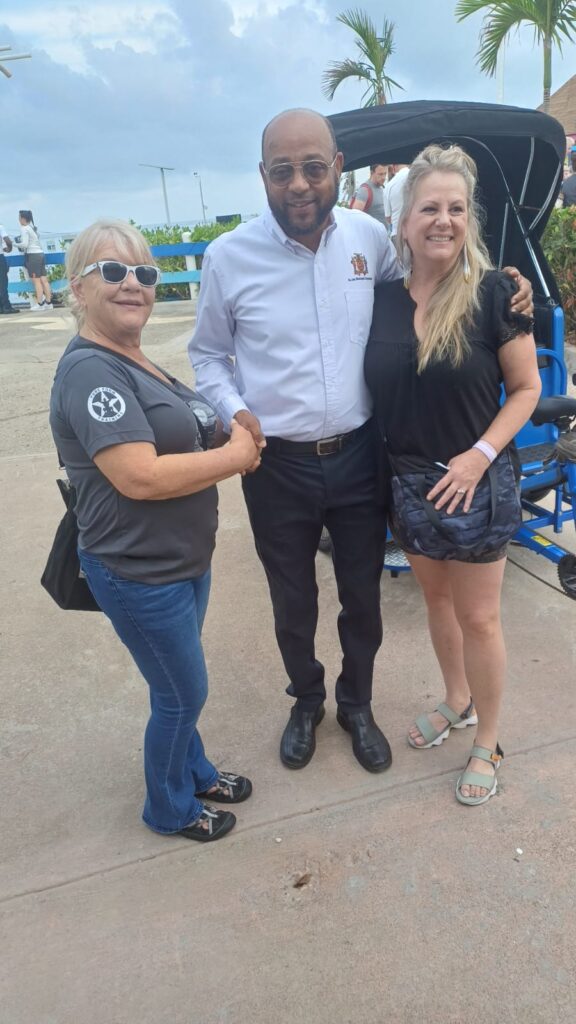 Mayor of St. Ann’s Bay, Councillor Michael Belnavis (centre) greets Suzie Phillips (left) and Heidi Hodges, who arrived aboard Carnival Corporation’s Holland America. The vessel docked at the Ocho Rios cruise-ship port in St. Ann on Tuesday (November 11). (Photo: JIS)