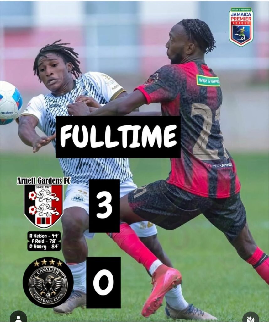 Playing at the Anthony Spaulding Sports Complex, home team Arnett Gardens destroyed Cavalier as Rushike Kelson opened the scoring in the 43rd minute before skipper Fabian Reid doubled the advantage in minute 78.