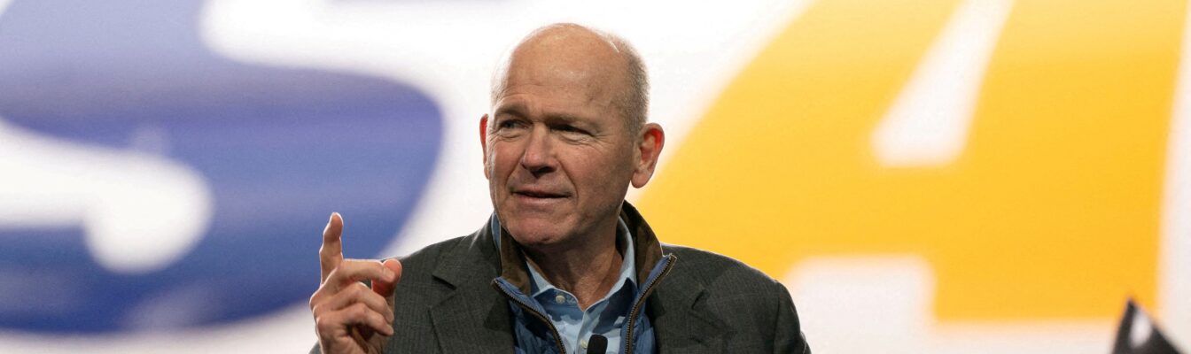 FILE PHOTO: Dave Calhoun, CEO of Boeing, speaks on stage during the delivery of the final 747 jet at their plant in Everett, Washington, U.S. January 31, 2023. REUTERS/David Ryder/File Photo