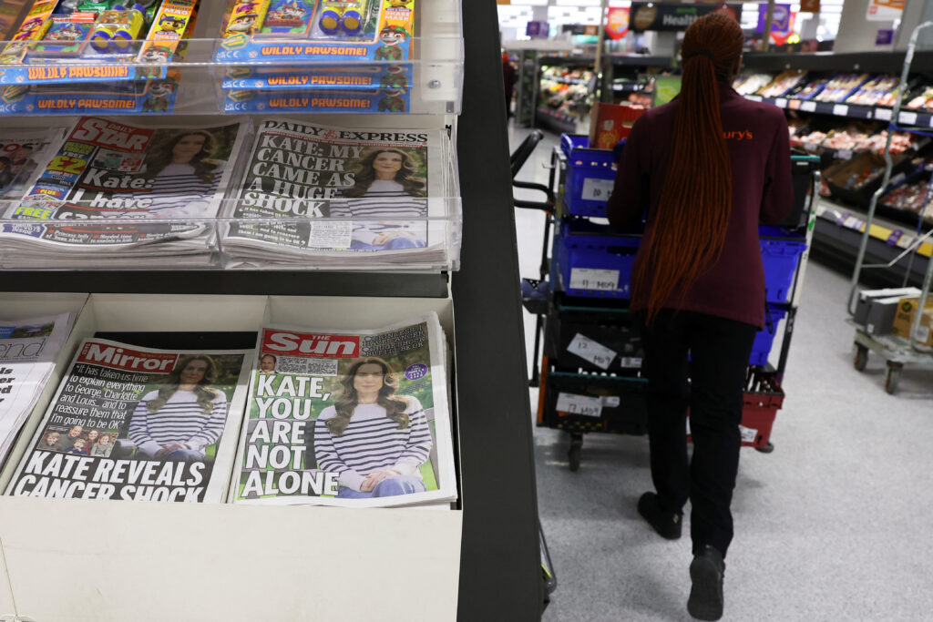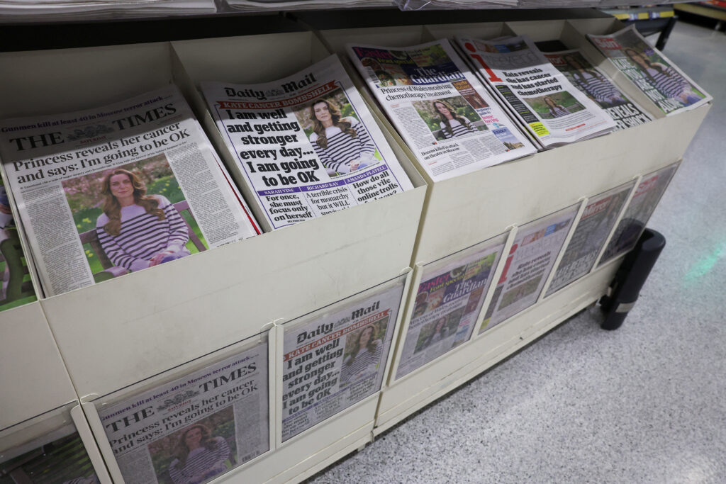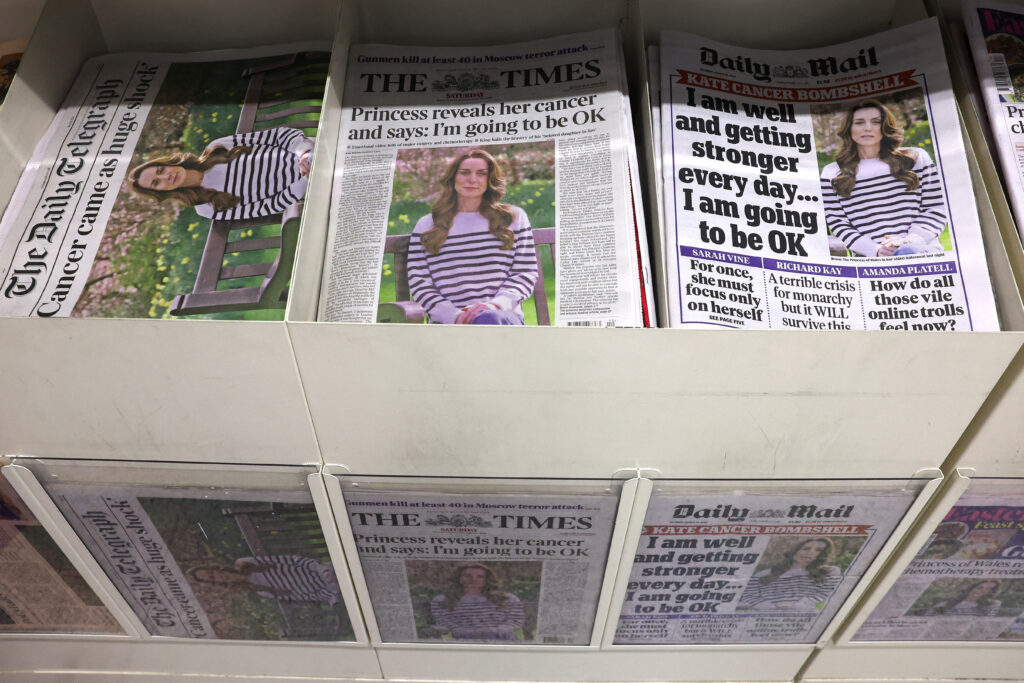 “Catherine’s Cancer Diagnosis Puts UK Royals on Even More Uncertain Terrain,” said the New York Times, noting that the grave health concerns of both the king and Kate are stretching an already slimmed down monarchy.
