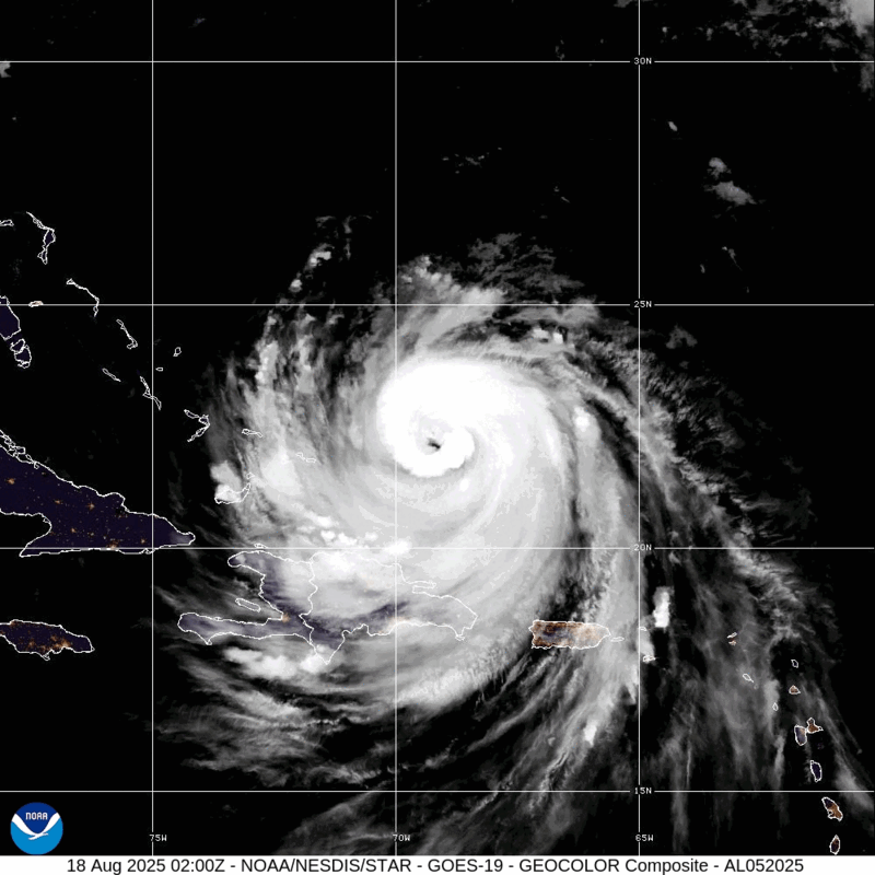 As at 2:00 am Atlantic Standard Time, the centre of Erin was located near latitude 22.6 North and longitude 69.9 West—or roughly 175 kilometres northeast of Grand Turk Island. Barrelling northwest at a slowed pace of 19 kilometres/hour, the major hurricane is currently packing maximum sustained winds at 215 kilometres/hour, with higher gusts.