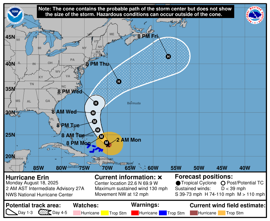 On the forecast track, meteorologists say that even though some weakening is forecast beginning tonight, Erin will remain a large and dangerous major hurricane through the middle of this week.