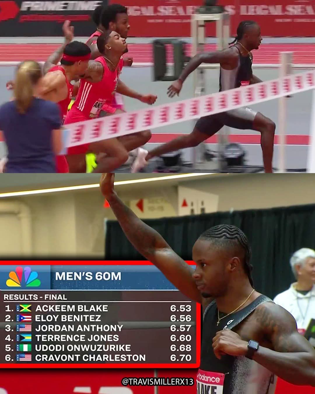 Jamaica had further success as Ackeem Blake captured the men’s 60m in a season’s best of 6.53 seconds. Puerto Rico’s Eloy Benitez was second just behind in 6.56, and American Jordon Anthony third with 6.57.