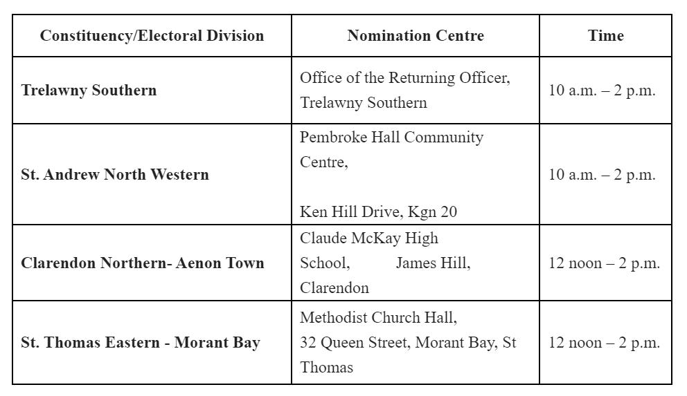 Nominations for Aenon Town in Clarendon Northern and Morant Bay in St Thomas Eastern will take place between the hours of 12 pm and 2 pm on Wednesday, November 6.