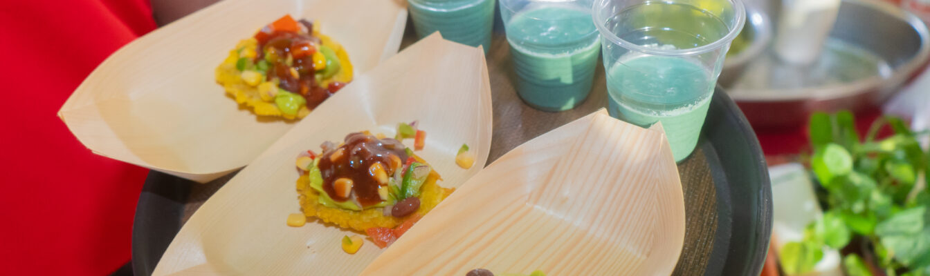 Crushed plantain and vegetables being served with cups of spirulina drinks as healthy food options at the launch event. (OUR TODAY photo/Dennis Brown)