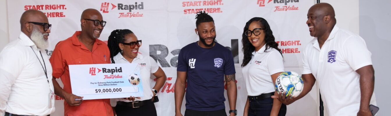 Caption: From left: Marcus Richards, Managing Director, Hardware & Lumber Limited; Darrington Ferguson, President, Duhaney Park Football Club; Kerry Edwards, General Manager, H&L Rapid True Value; and Kemar Reid, striker; Cameika Harris, Manager, Retail Operations, H&L Rapid True Value and Clareton Walker, Director, Duhaney Park Football Club. The group gathered for the announcement of H&L’s landmark $9 million sponsorship agreement with Duhaney Park Football Club, aimed at strengthening community ties and supporting the club’s journey back to the Premier League.