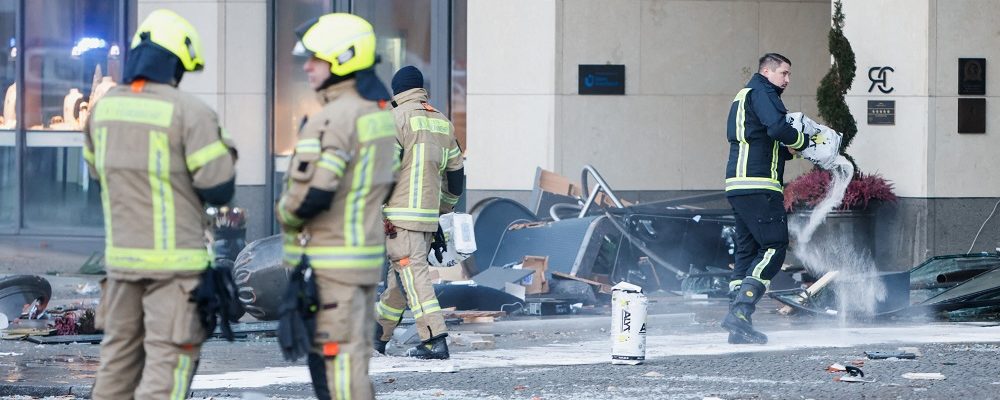 Emergency services shut a major road next to the complex that leads from Alexanderplatz toward the Brandenburg Gate due to the large volume of water that had flooded out of the building.