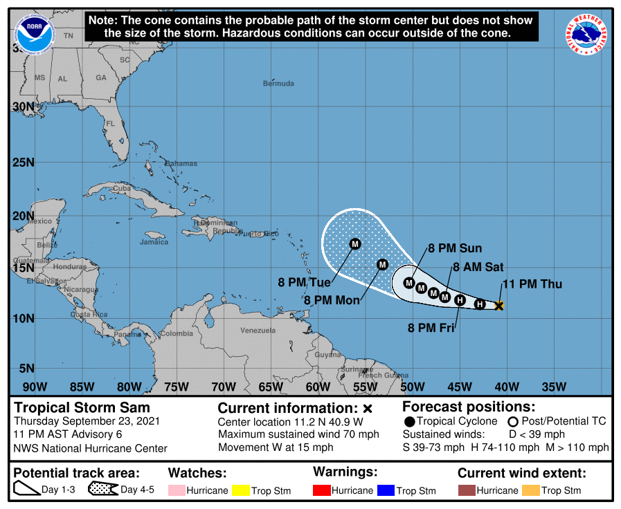 The NHC, in a 5:00 am Atlantic Standard Time (AST) bulletin, is sticking by its forecasts of rapid intensification for Hurricane Sam in the coming hours, which could reach category three status as early as Friday night or Saturday morning.