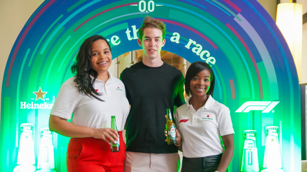 Race car driver Tommi Gore (middle) poses for a photo at the Heineken Race Track arch, accompanied by Amoye Phillpots Brown (left), Heineken Brand Manager, and Hanna Turner (right), Heineken Junior Brand Manager.(Photo: Contributed)