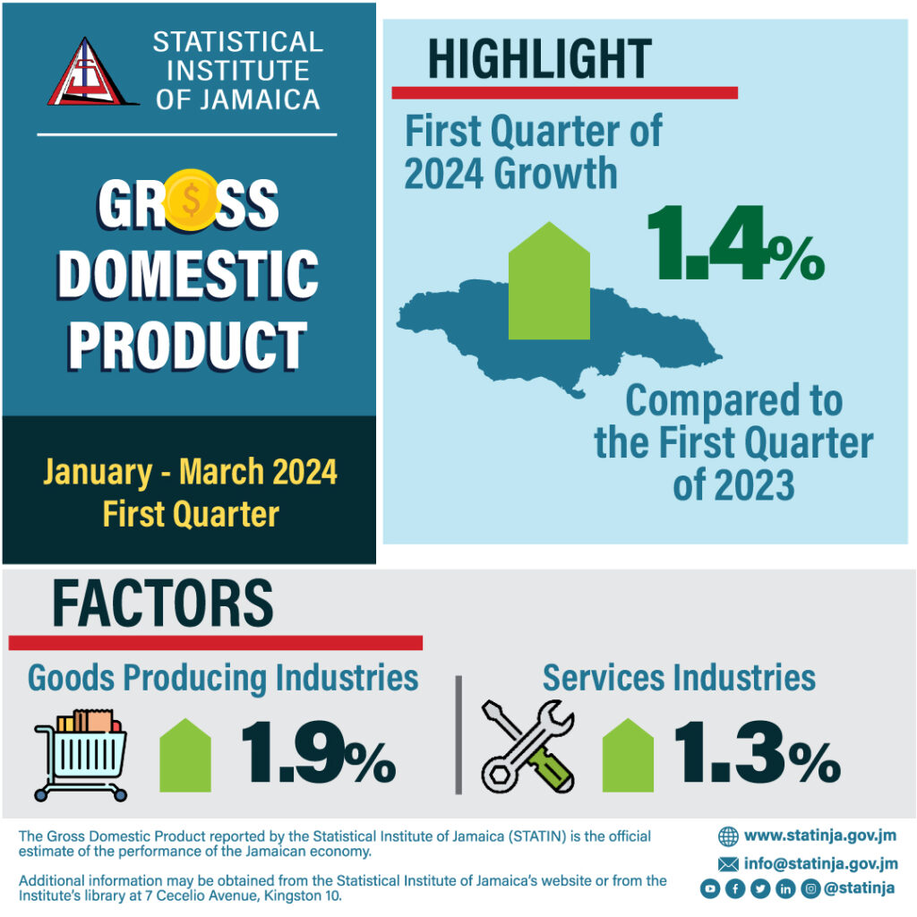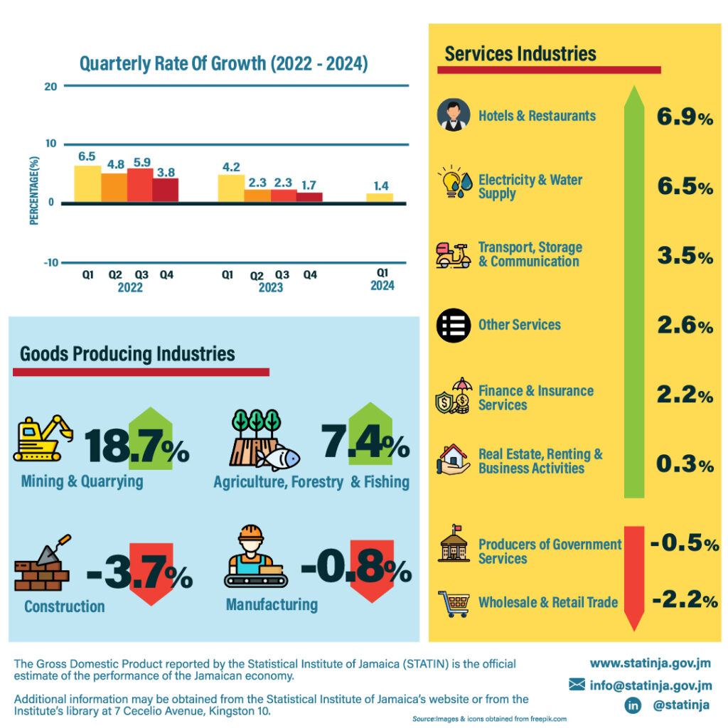 Jamaica’s goods-producing and services sectors grew strongly in the first quarter of 2024, resulting in the local economy posting a creditably 1.4% rise.