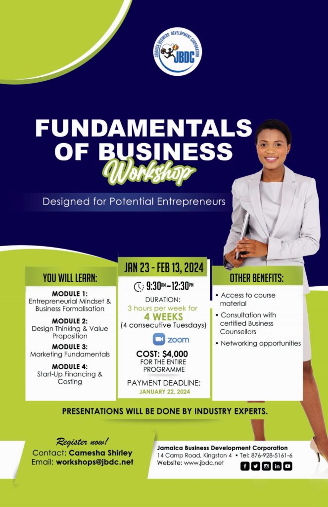 The Jamaica Business Development Corporation (JBDC) will be hosting a series of online workshops aimed at providing Jamaicans with tools on the fundamentals of starting and running successful businesses.