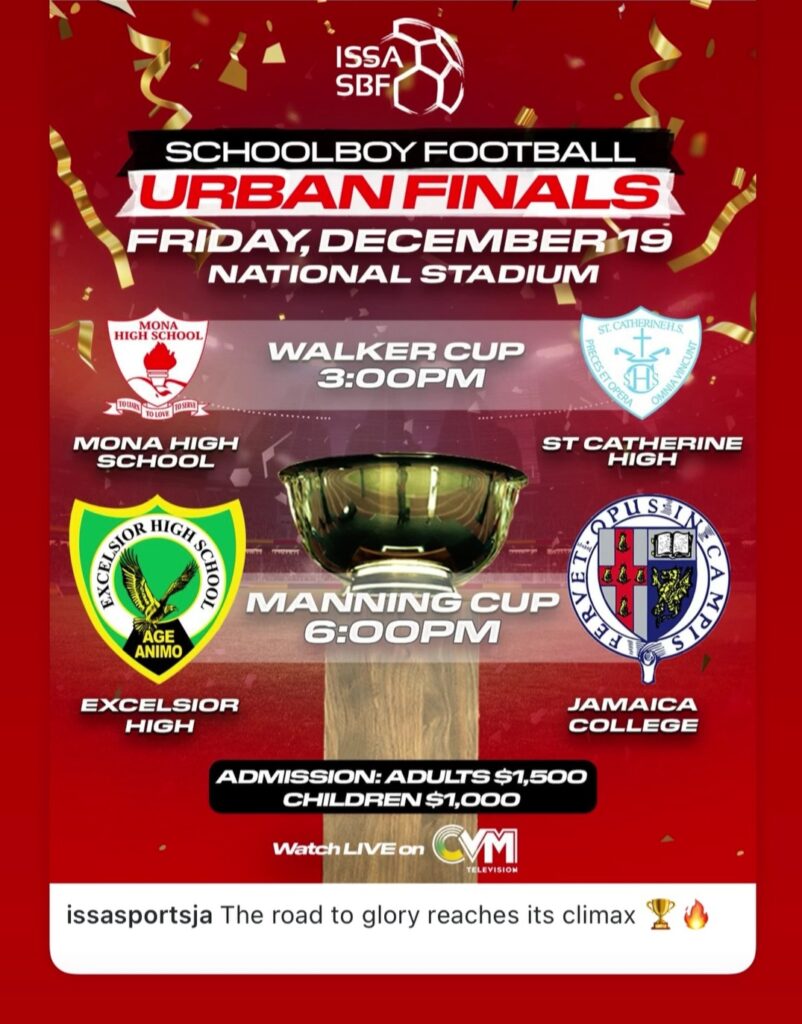 In the curtain raiser at 3:00 pm, defending champions Mona High take on St Catherine High for the Walker Cup crown, then at 6:00 pm, Jamaica College tackle Excelsior High for the prestigious Manning Cup to determine the best school in the Corporate Area.