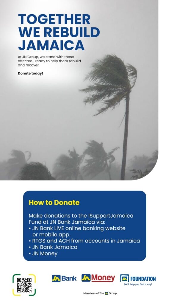 “We invite you to make monetary donations to the I Support Jamaica Fund, which is managed by JN Foundation via JN Bank, JN Money.” Information on how to donate is available on the JN Foundation website, jnfoundation.com/hurricane-melissa-relief/.