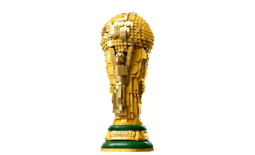 It’s a life-size World Cup trophy, but with a playful twist, it’s built from 2,842 Lego bricks.
