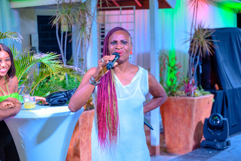 With a Johnnie Walker cocktail in hand, Red Stripe’s finance cirector, Yaniece Gentles, was a picture of perfection in an abstract print blue and white dress. (Photo: Contributed)