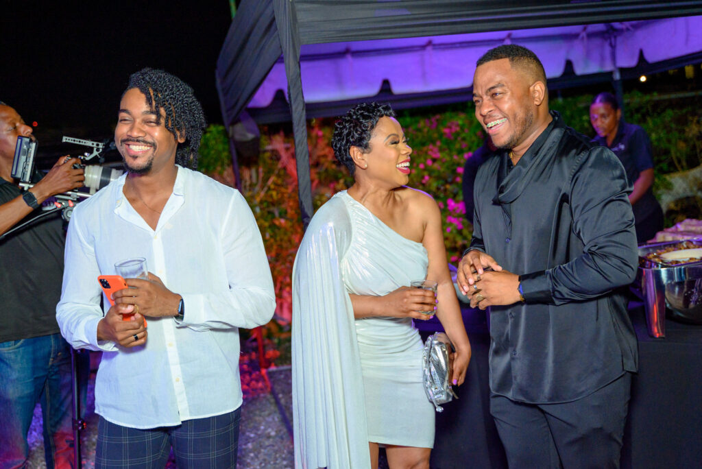 Friends Jamaro Marville, Erica Corlett and Garfene Grandison share a laugh at Mark Anthony’s new leather collection launch. (Photo: Contributed)
