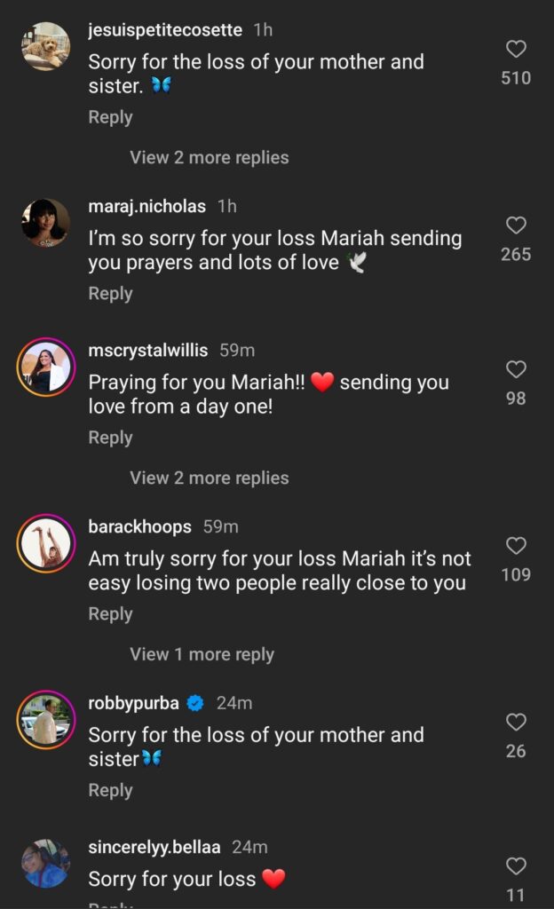 As Carey mourns her mother and sister’s passing, her fans have taken to social media offering their heartfelt support, sending love and strength to Mariah and her family during this unimaginable time.