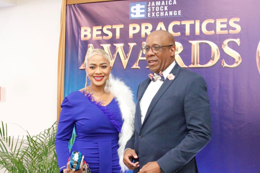 From left: The evening’s emcees Debbie Bissoon and Nigel Coke, member of the JSE Best Practices Awards committee and chairman for the Northern Caribbean University (NCU) media advisory board, stun on the carpet at the Jamaica Stock Exchange Best Practices Awards.(Photo: Contributed)