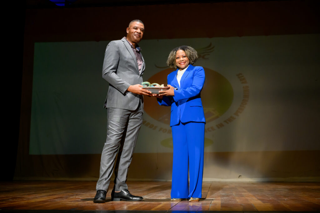 Education Minister Dr. Dana Morris Dixon, presents an award to artist Patrick Hall, a former gold medalist in the JCDC Visual Arts Competition (Ceramics), during the Marcus Garvey Awards for Excellence ceremony held on Wednesday, October 15, 2025, at The Little Theatre. (Photo: Contributed)