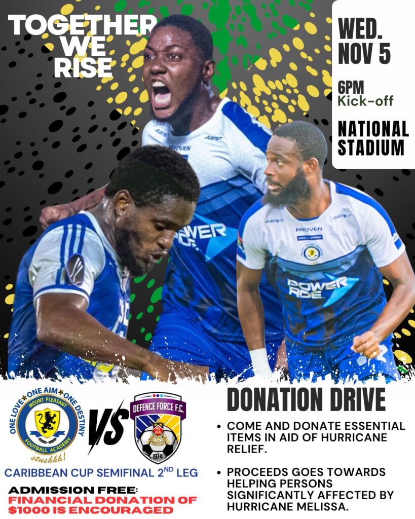 In a press release dated Saturday, November 1, Mount Pleasant announced that they will be using the upcoming Caribbean Cup semifinal 2nd-leg clash against Trinidad’s Defence Force FC to launch a donation drive in support of Jamaicans and communities severely affected by Hurricane Melissa.