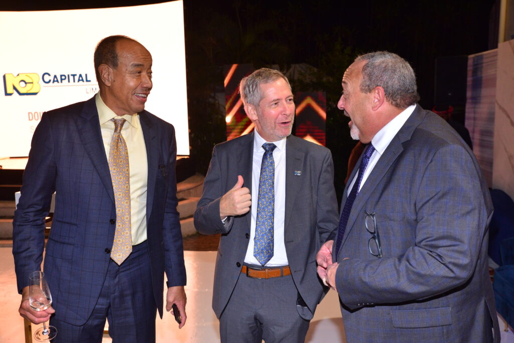 (l-r) Executive Chairman, NCB Financial Group, Michael Lee-Chin; CEO, NCBJ, Bruce Bowen in an animated discussion with Geoffrey Charlton, Mandeville private client, Canada at ‘Doing Wealth Differently’. (Photo: Contributed)