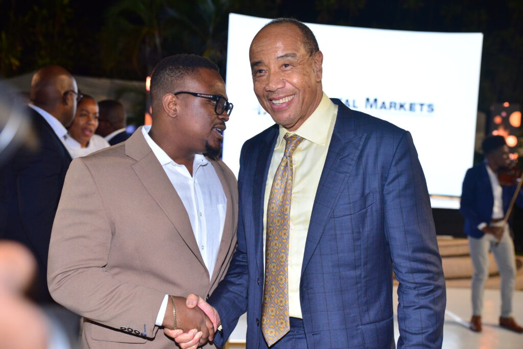 Gordon Swaby, Founder and CEO of the JSE Junior Market-listed company, EduFocal, and Michael Lee-Chin O.J., Executive Chairman NCB Financial Group enjoy a quick chat at ‘Doing Wealth Differently’. (Photo: Contributed)