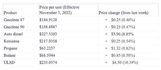 In their latest index, Ultra Low Sulfur Diesel sees the largest increase of 10.38 per cent, that’s $4. 50