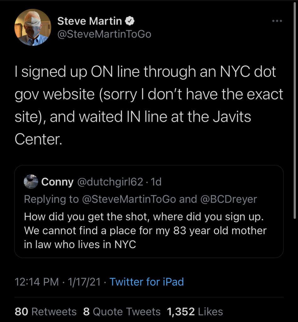 Fans subsequently got in a frenzy asking where and how Martin signed up. One fan in particular, @dutchgirl62, said she had trouble getting her 83-year-old mother vaccinated.