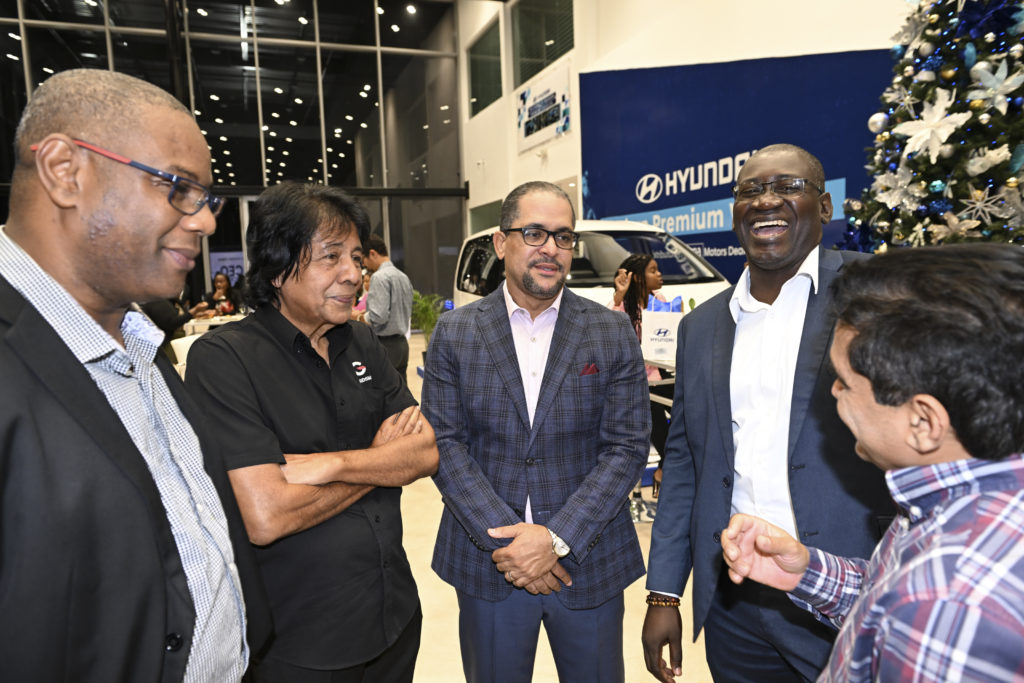 From left: Vice President of Scotiabank, Morris Nelson, Guardsman Group Founder, Kenneth Benjamin, Magna Motors Dealership Limited’s CEO, Erick Gutierrez, Kingston Wharves Limited Group CEO, Mark Williams and Managing Director for the Guardsman Group, Vinay Walia, in conversation at the Magna Motors – Hyundai Jamaica CEO Cocktail at the Magna Motors Oxford Road Showroom on November 10, 2022.