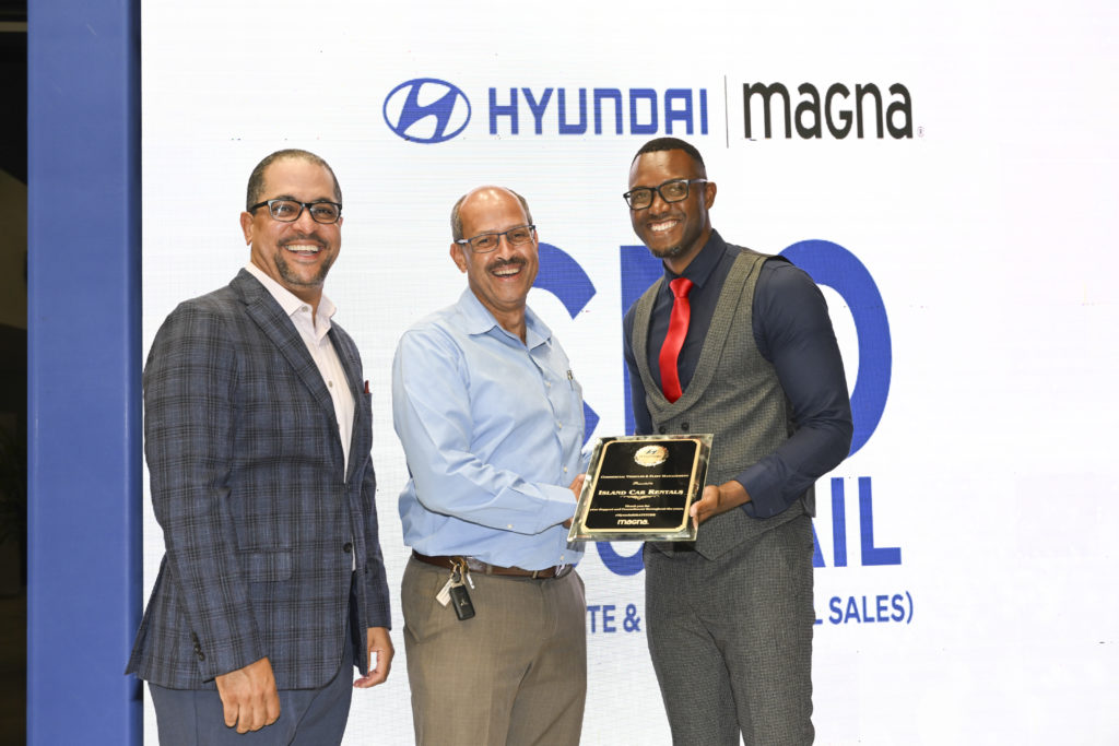 Magna Motors Dealership Limited’s CEO, Erick Gutierrez (left) and Commercial and Customer Relationship Manager, Etmour Williams (right), present Digicel Jamaica representative, Ricardo Steele (centre), with an appreciation award for years of support as a valued Commercial client at the Magna Motors – Hyundai Jamaica CEO Cocktail on November 10, 2022.