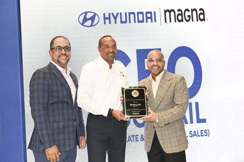 Magna Motors Dealership Limited’s CEO, Erick Gutierrez (left) and After-Sales Director, Jose Melo (right), present Christopher Tomlinson (centre) an appreciation award for Beryllium’s support as a Commercial client at the Magna Motors – Hyundai Jamaica CEO Cocktail on November 10, 2022.