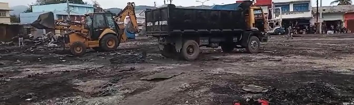 A front-end loader was observed packing debris from the fire onto a truck, which left some 200 vendors with nursing millions of dollars in losses.