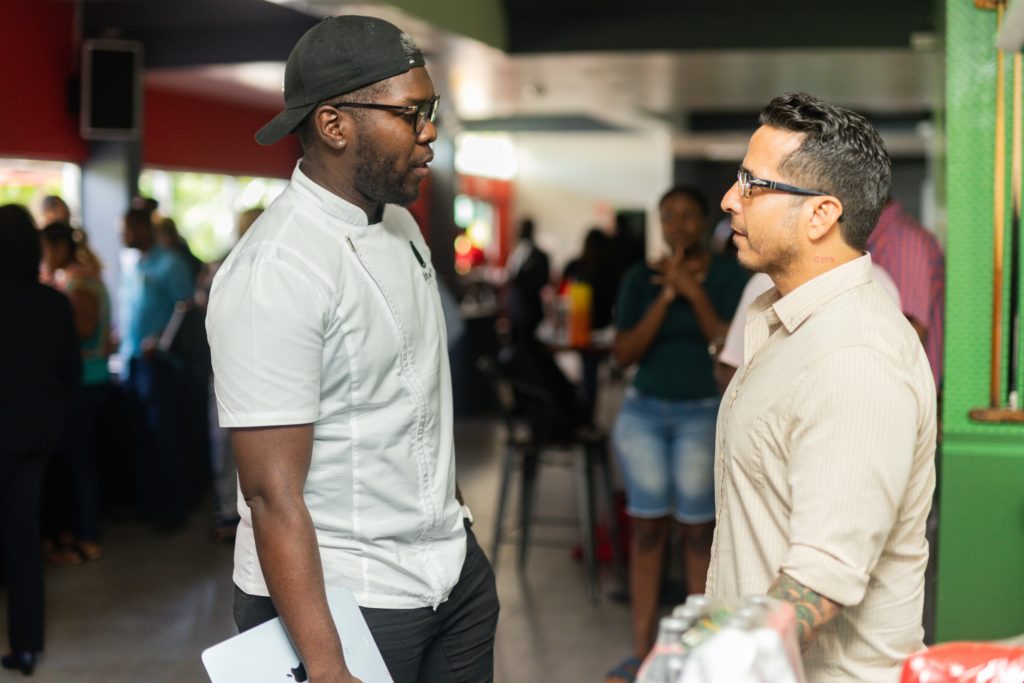 Owner of Broken Plate, Chef Damion Stewart (left) shared ideas with owner of Holy Smoke Bar & Grill, Chris Peyrefitte (right).