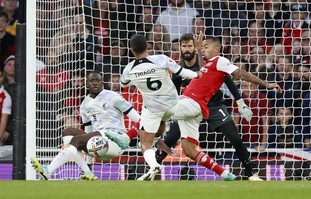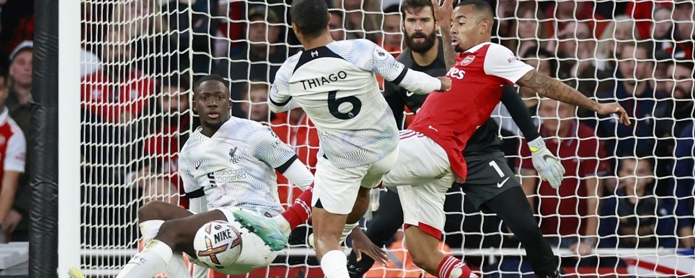 Arsenal came blazing back and a wild series of shots and blocks ended in a penalty when Liverpool’s Thiago Alcantara was adjudged to have fouled Gabriel Jesus and Saka made no mistake from the spot to put his side 3-2 up in the 76th minute.