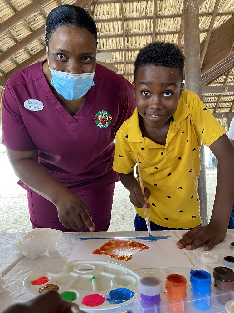 Kids Camp Counsellor at Beaches Negril, Pollyanna Wallace assisted Amari Malcom from Broughton Primary School in painting the starfish he saw at sea on his glass bottom boat tour with the Sandals Negril and Beaches Negril team.