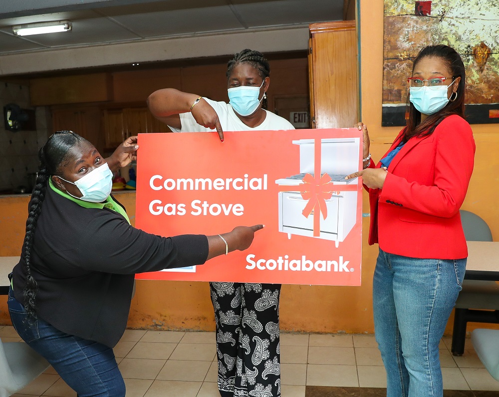 An excited Cordell Huie ( left), manager of the Blessed Assurance Home, accepts a symbolic presentation of a commercial gas stove and oven from Andrea Rhule-Hudson ( right), manager of the Scotiabank Fairview branch. Sharing in the moment is Janet Richards ( centre), representative from the United Way of Jamaica, with which the Bank has partnered to deliver gifts totalling $2.2 million to private child care facilities across the island.
