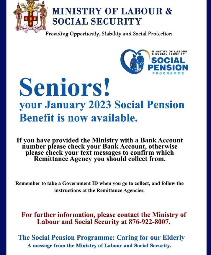 The Social Pension Benefit for January is now available, the Ministry of Labour and Social Security indicated Wednesday (January 18) on its social media pages.