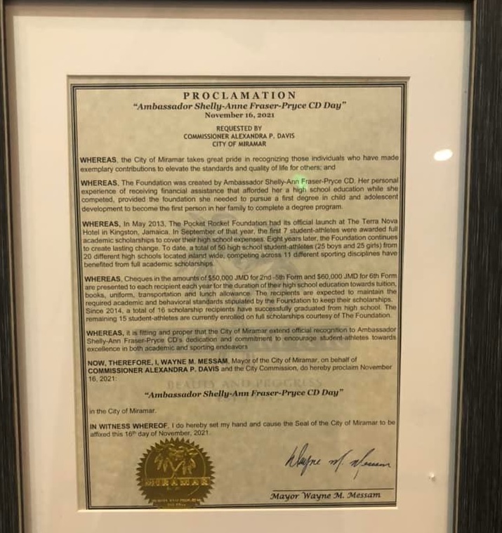 The four-time 100m World Champion was also honoured when Alexandra Davis, the City Commissioner for Miramar, declared November 16, Shelly-Ann Fraser-Pryce Day.