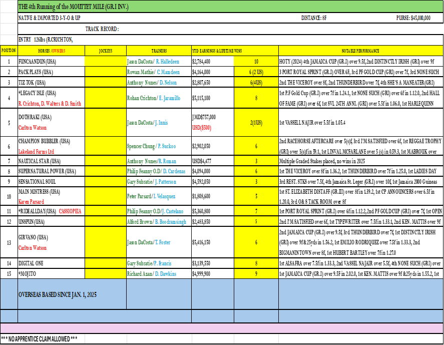 “This year, we brought back the exciting ‘Win and You’re In’ feature, which gives horses domiciled in Jamaica the chance to earn automatic entry into the Mouttet Mile by winning one of our four major races between January 1 and November 30, 2025.”