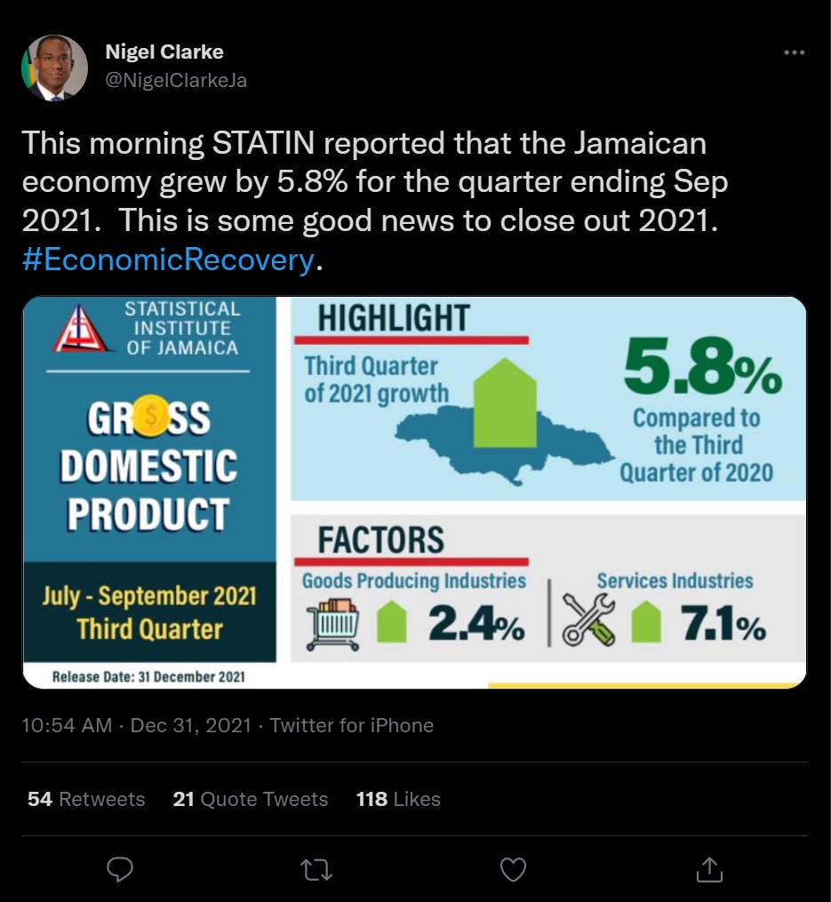 For his part, Minister of Finance and the Public Service, Dr Nigel Clarke, reacting to the latest STATIN findings heralded the economic report as good news to close out 2021.