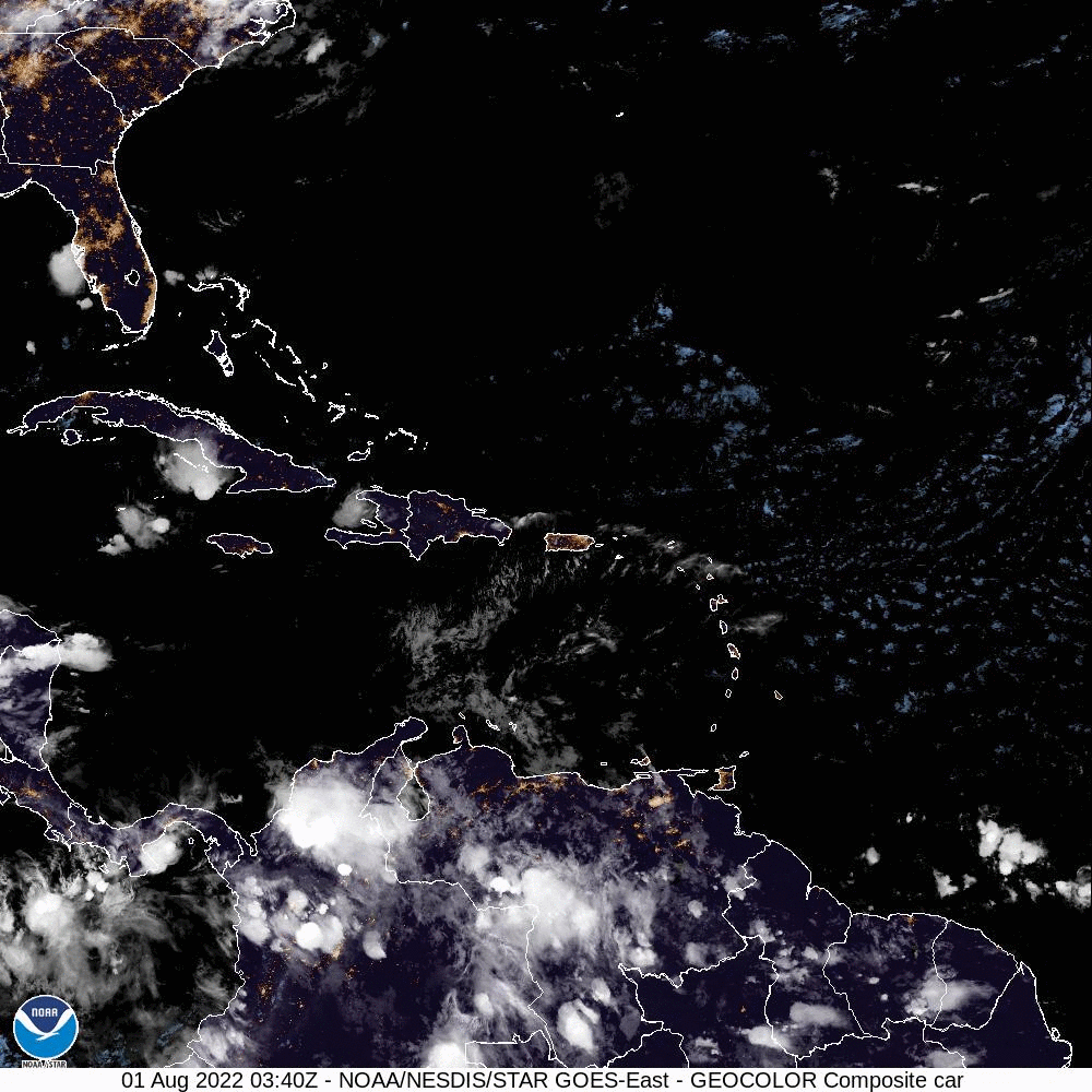 A satellite-generated time-lapse of weather conditions across the Caribbean Basin, up to 7:00 am Eastern Standard Time (EST) on August 1, 2022, shows Saharan dust clearly visible from space. (Content courtesy of NHC/NOAA)