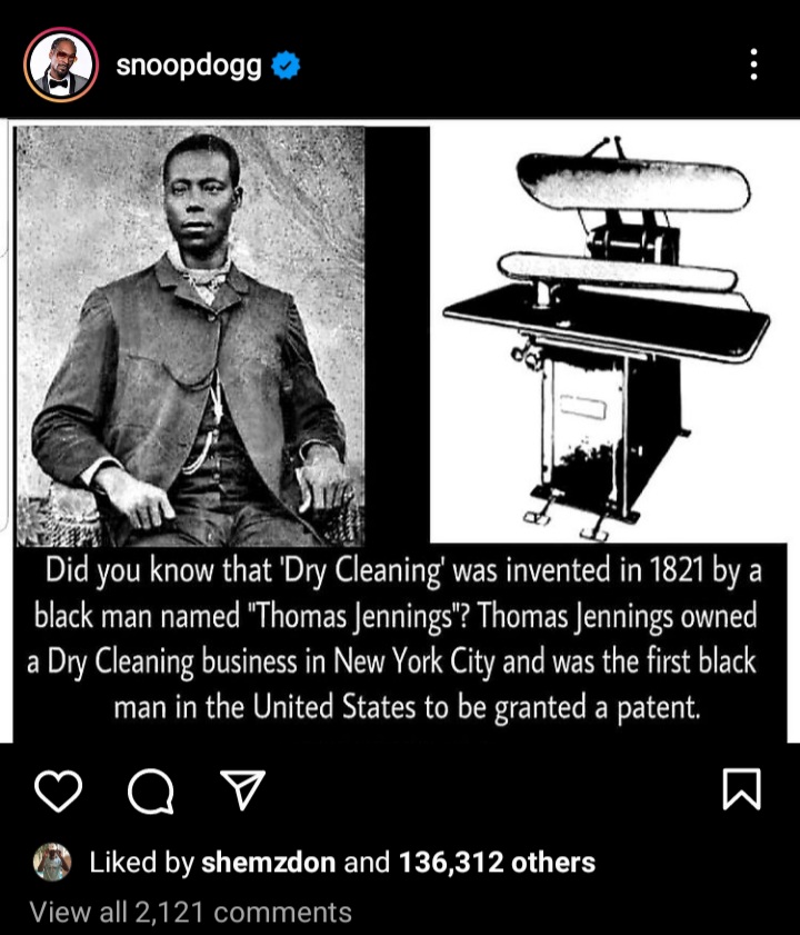 The post read: “Did you know that ‘dry cleaning’ was invented in 1821 by a black man named ‘Thomas Jennings’? Thomas Jennings owned a dry cleaning business in New York City and was the first black man in the United States to be granted a patent.”