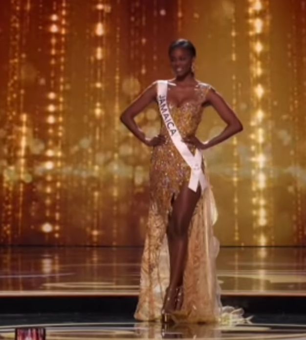 Calvin also excelled in the preliminary swimsuit performance where she wore a blue swimsuit that was accentuated by a cape that had boldly written words ‘Out of Many’ and a drawing of the island.