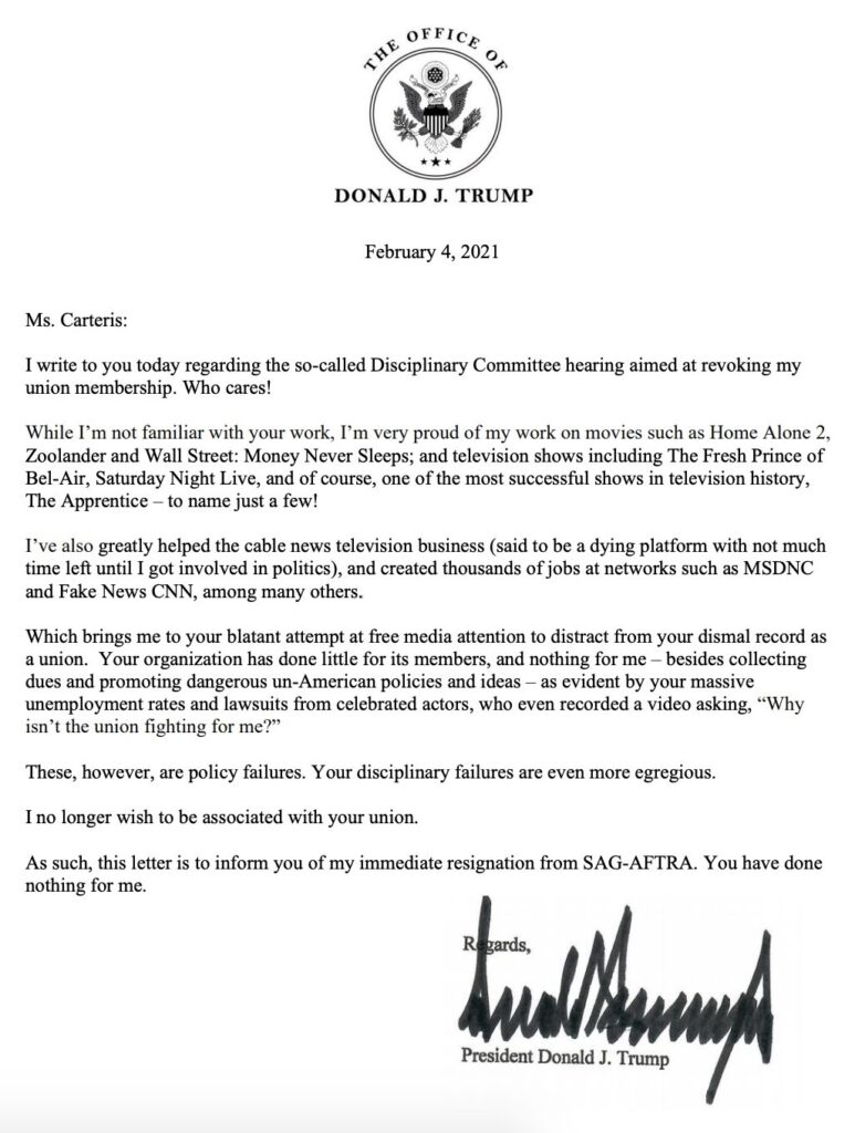 “Who cares!” Trump wrote in a letter that the union released. “I no longer wish to be associated with your union.”