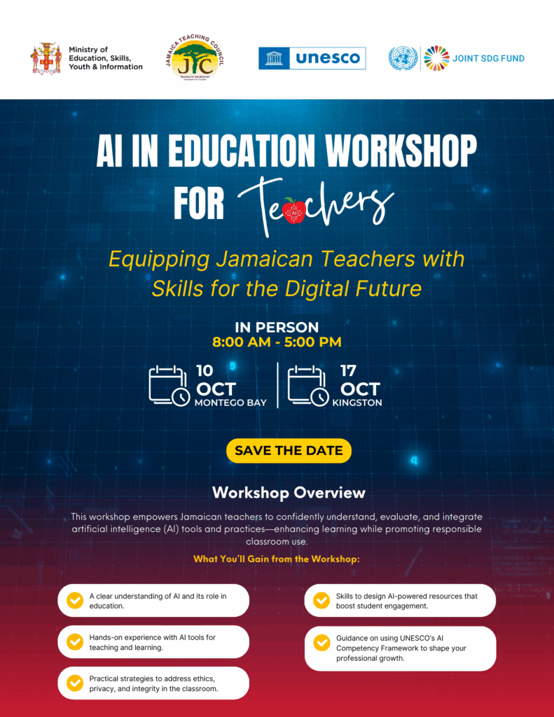 The United Nations Educational, Scientific and Cultural Organisation (UNESCO) Office for the Caribbean, in partnership with the Jamaica Teaching Council (JTC), an agency of the Ministry of Education Skills, Youth and Information (MoESYI) will host two transformative AI in Education Workshops to empower teachers across Jamaica to harness the potential of Artificial Intelligence (AI) in their classrooms.