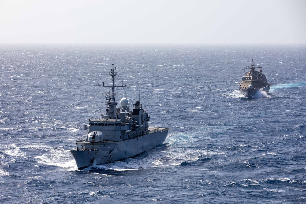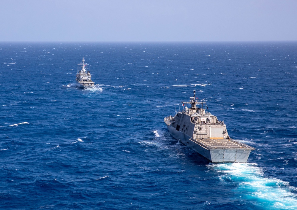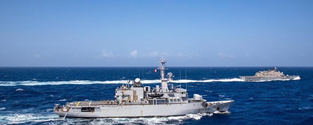 The French Floréal-class frigate FS Germinal (F735) and the Freedom-variant littoral combat ship USS Milwaukee (LCS 5) conduct a bilateral maritime exercise in the Caribbean Sea, Feb. 16, 2022. Milwaukee is deployed to the U.S. 4th Fleet area of operations to support Joint Interagency Task Force South’s mission, which includes counter-illicit drug trafficking missions in the Caribbean and Eastern Pacific. (Photo: US Navy/ Mass Communication Specialist 2nd Class Danielle Baker/Released)