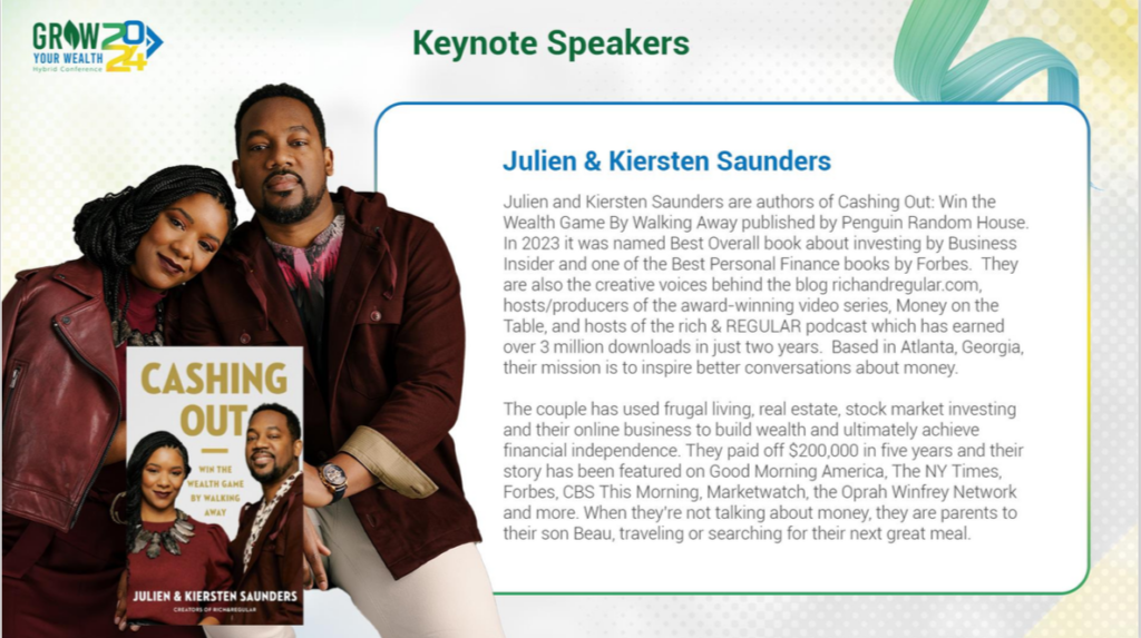 “We are excited to announce that wealth-building heavyweights Julien and Kiersten Saunders are this year’s Keynote speakers. Our focus this year is Acceleration and our choice of keynote speakers is meant to help our attendees design a blueprint for building wealth through business and strategic investments,” she added.